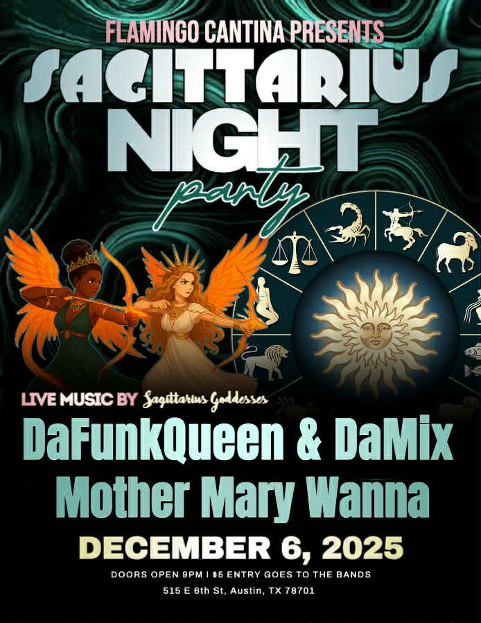 are calling all faries and enchanted beings to celebrate the life of the party zodiac Sagittarius. This December 6th the Flamingo Cantina is hosting a live musical and magical event. DaFunkQueen and DaMix will be closing out the night with a jam so bring ya instruments and ya ass. The beautiful saggerific Mary Cherry will be opening with her band Mother Mary Wanna