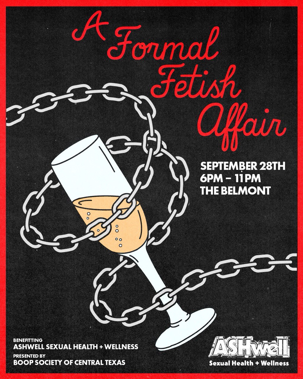 The Boop Society of Central Texas and ASHwell Sexual Health + Wellness have come together for a very kinky night of glamour. Wear your best fetish wear with a formal twist and prepared to be wine, dined, and sixty-nin….. Well, you know the rest.