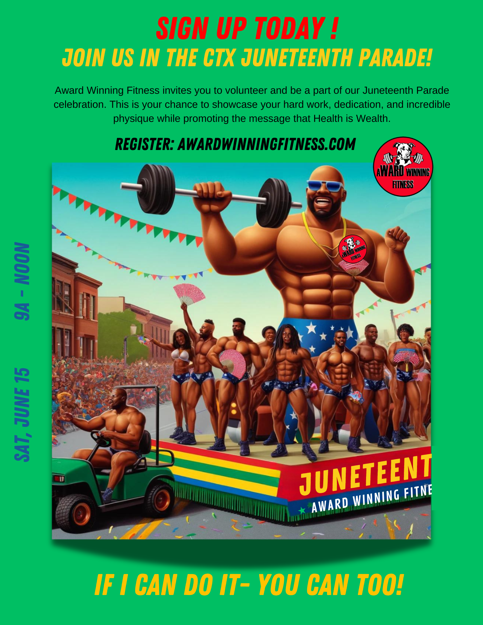 Award Winning Fitness invites you to volunteer and be part of our Juneteenth Parade celebration.