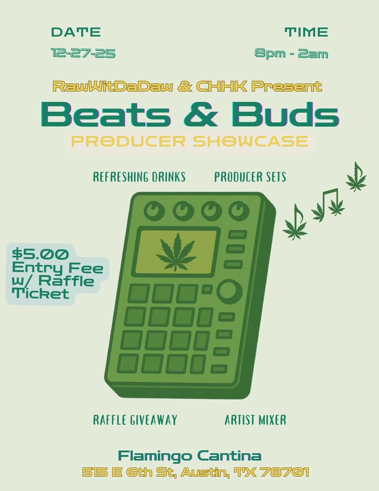 RawWitDaDaw & CHHK Presents Beats & Buds! An immersive producer showcase & artist mixer showcasing the multitudes of talents in the Austin Hip Hop Community. Join us for a lit night in an elevated environment held at the legendary Good Vibes Club Flamingo Cantina! Hosted by CasinoATX & Big Mic
