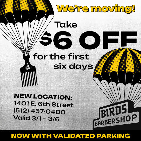 Birds Barbershop is celebrating the relocation of its East 6th shop to 1401 E. 6th St. with a special promotion of $6 off haircuts the first 6 days of business, starting Fri., March 1 through Wed., March 6, 2024. A portion of proceeds from the opening week will be donated to benefit the historic preservation organization Six Square.
