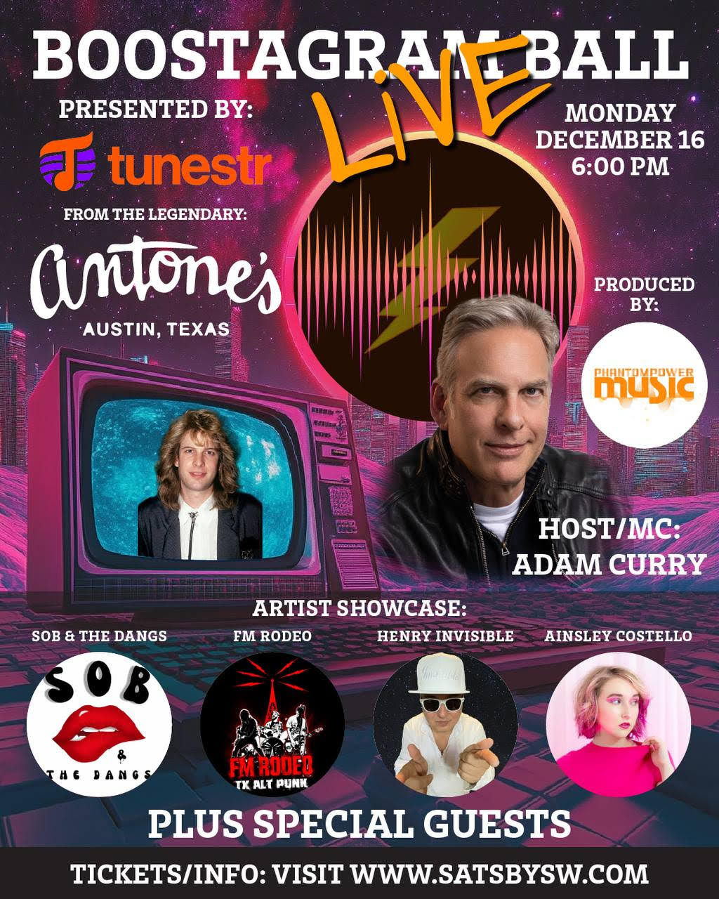 Hosted by Adam Curry, this live concert consists of thirty minute sets by Austin’s SOB and the Dangs who will bring the funk grooves.