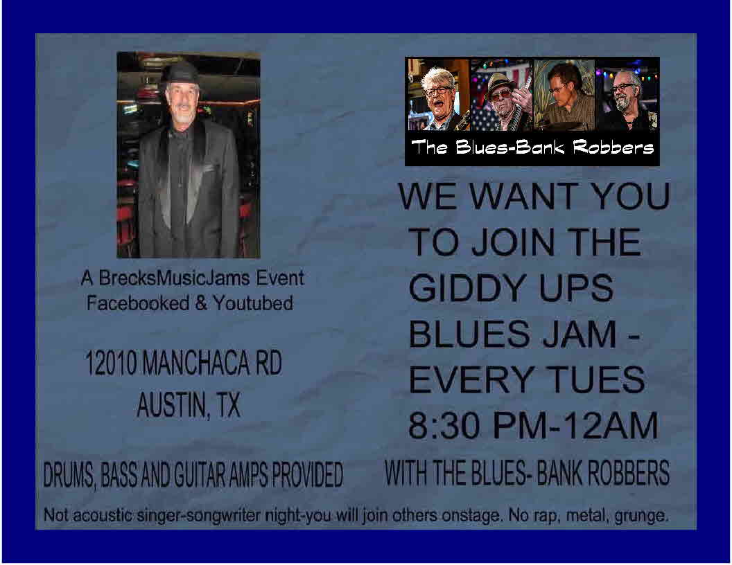For over 13 years, Blues Aficionados either as musicians or as listeners venture out to the weekly “Tuesday’s Just As Bad” Blues Jam in South Austin. Every Tuesday, Breck English (aka Leghound) known in Austin musicians’ circles as @BreckMusicJams gets together with the Blues-Bank Robbers (BBR) to invite y’all to come down, sit in, and jam along.
