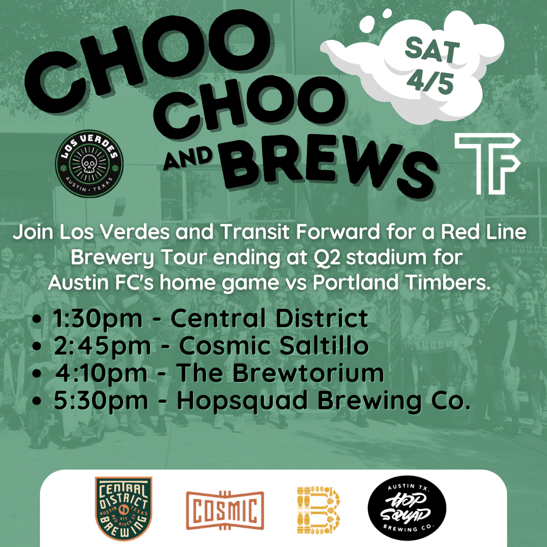 Join Los Verdes and Transit Forward for a Red Line Brewery tour ending at Q2 Stadium for Austin FC’s home game against the Portland Timbers.