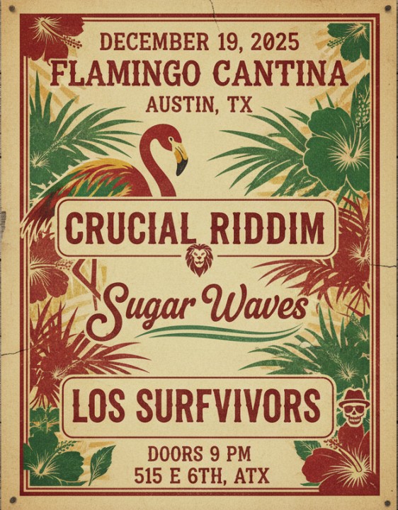Crucial Riddim is reggae and ska with a twist of hardcore, hip-hop, punk, metal, and more, spreading a message of love and positivity and telling a story. Joined by Los Surfvivors (surfers who make surf music) and Sugar Waves–come out and keep it crucial!
