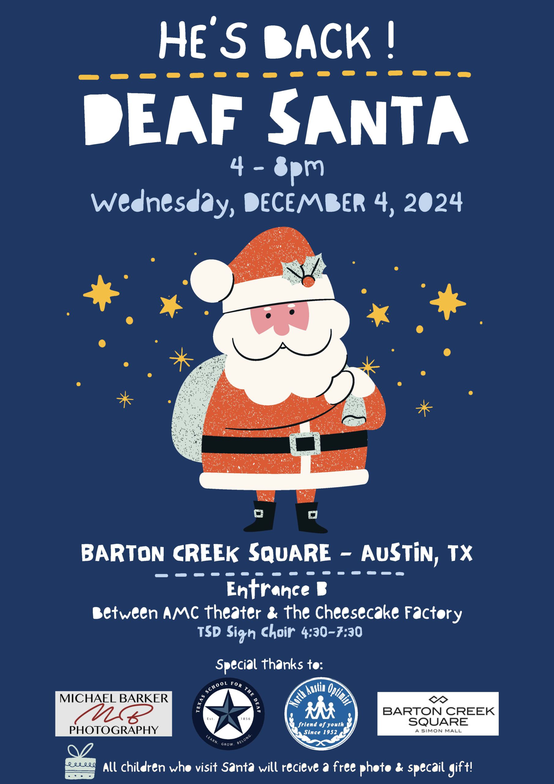 Santa arrives at Barton Creek Square mall today ready to visit with area children who are deaf or hard of hearing.