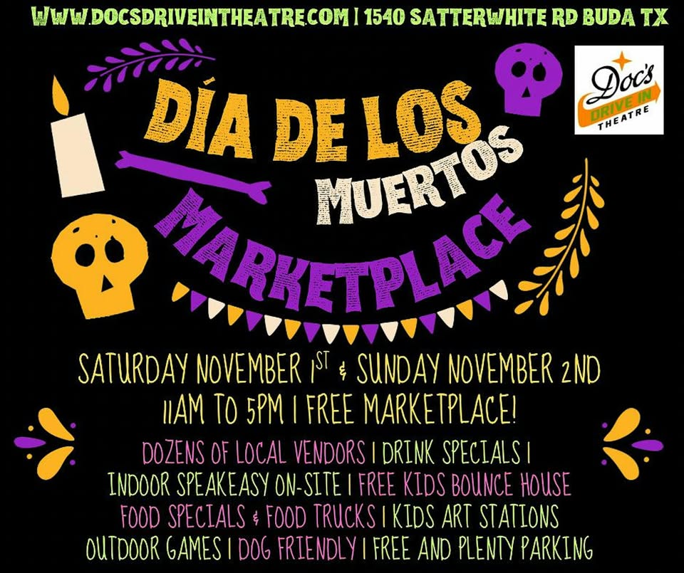 Welcome to the Dia De Los Muertos Marketplace at Doc’s Drive In Theatre ! Get ready for a day filled with vibrant colors, delicious food, and unique crafts. Join us on November 1 and 2, 2025 at 11:00 AM- 5:00PM to celebrate this traditional Mexican holiday. Come and browse through a variety of vendors offering handmade items, traditional decorations, and more. Don’t miss out on this cultural experience!