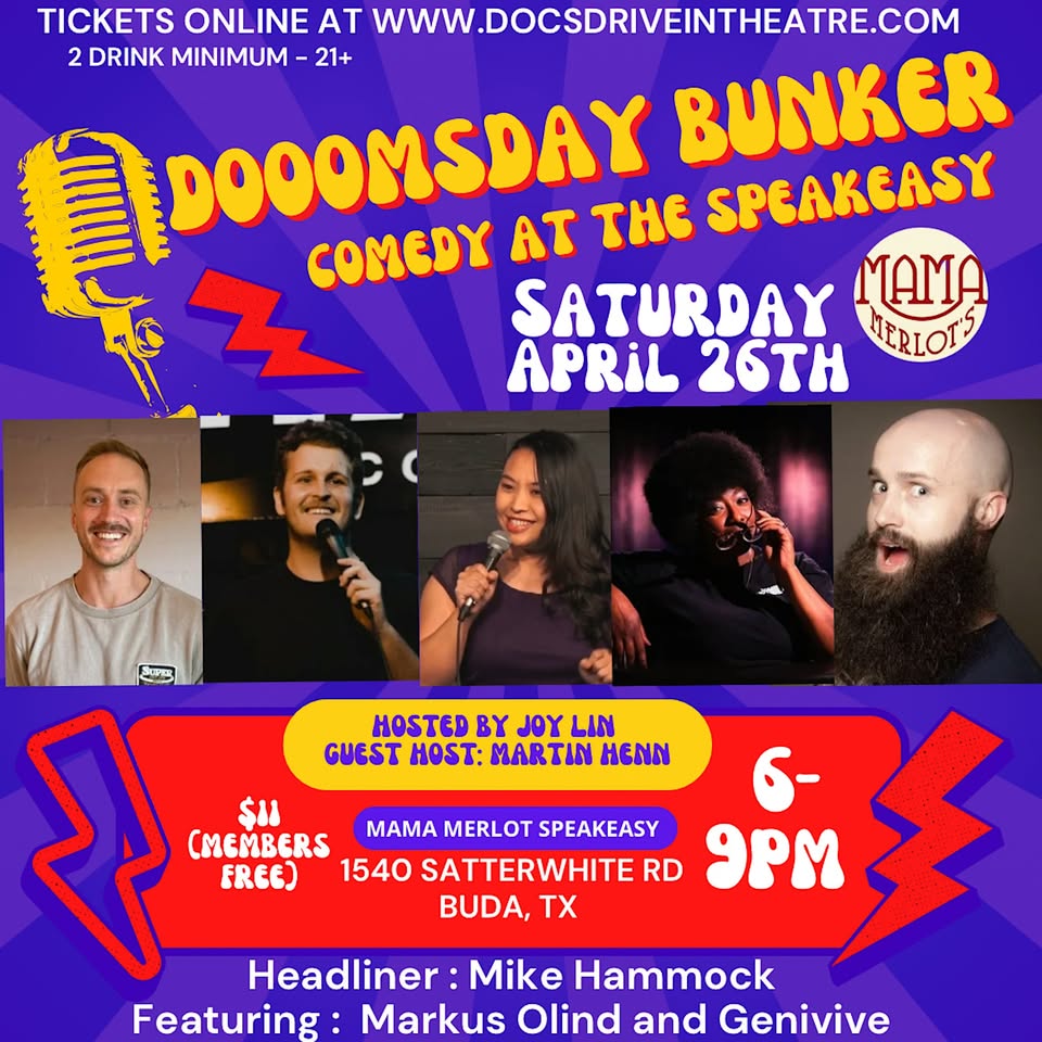 Welcome to the **Doomsday Bunker Comedy at the Speakeasy** event! Get ready to laugh your socks off at Mama Merlot’s Speakeasy on **Sat Apr 26 2025** at **6:00 PM-9:00PM**.
