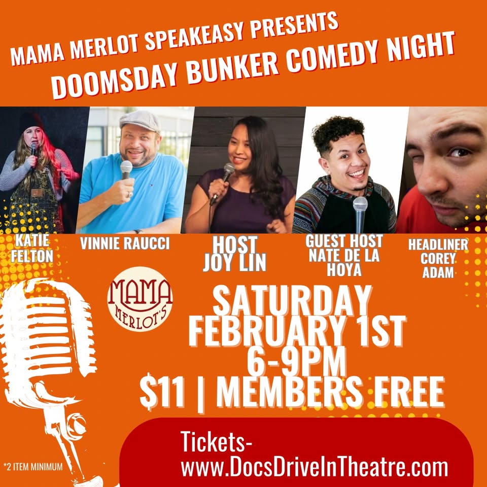 Welcome to the **Doomsday Bunker Comedy Show at the Speakeasy**! Get ready for a night of laughter and fun at Mama Merlot’s Speakeasy. Join us on **Sat Feb 01 2025** at **6:00 PM** for a hilarious comedy show that will have you rolling in your seats. Our talented comedians will keep you entertained all night long. Don’t miss out on this one-of-a-kind event! See you there!