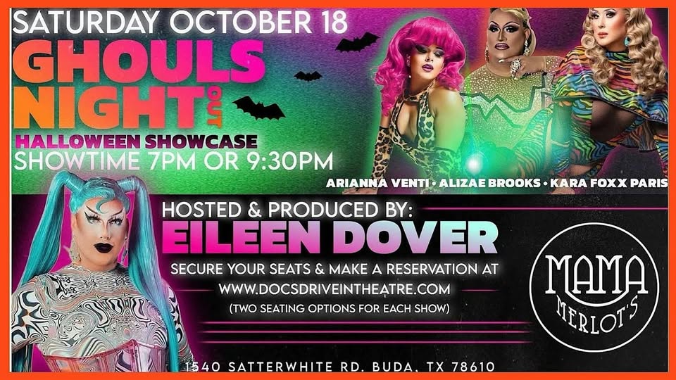 Come join us for a fabulous night of entertainment at Drag Show! Ghouls Night on October 18, 2025 at 7pm or 9:30pm . Get ready for jaw-dropping performances and a night filled with laughter and fun!