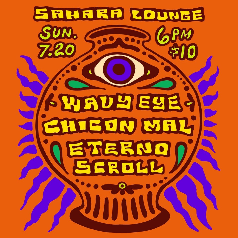 Join us at Sahara Lounge Sunday July 20 with live sets by psych rockeros Eterno Scroll, Chicon Mal and Wavy Eye! $10 cover, 21+