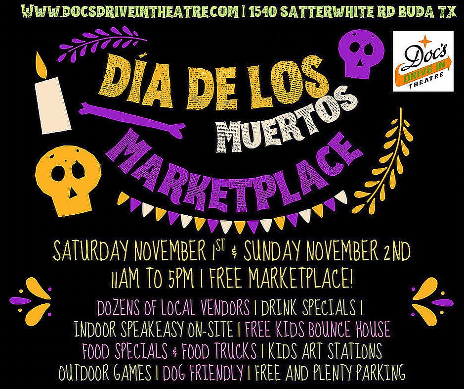 Join us on Saturday, November 1st, and Sunday, November 2nd, at Doc’s Drive-In Theatre for a FREE Dia de los Muertos Marketplace! Open from 11am-5pm!