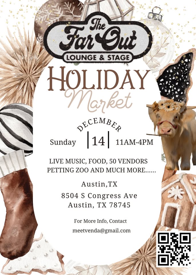 The Far Out Holiday Market is happening Sunday, December 14, and you’re invited to shop, sip, listen, and enjoy the full festive vibe. Live music, delicious food, 50 amazing vendors, a petting zoo, and so much more. Come spend the day with us and kick off the season in the best way.