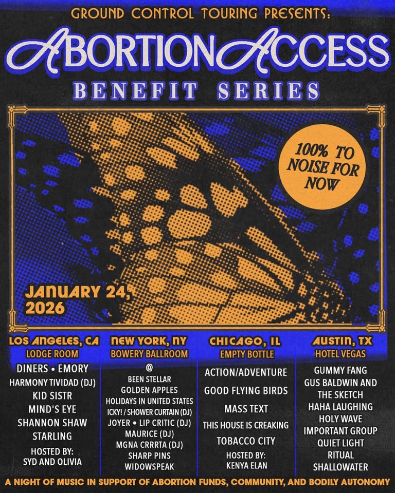 Ground Control Touring returns with their fourth annual Abortion Access Benefit Series in partnership with NOISE FOR NOW (NFN), a nonprofit specializing in reproductive justice. Set to take place across Los Angeles, New York City, Chicago and Austin on Saturday, January 24, 2026 – the event strives to build awareness, community and fundraise for abortion support. Since its inception in 2023, the series has raised over $200,000 via sixteen sold out nationwide events, with performances by over 100 artists and silent auction bundles provided by dozens of community sponsors and local businesses.