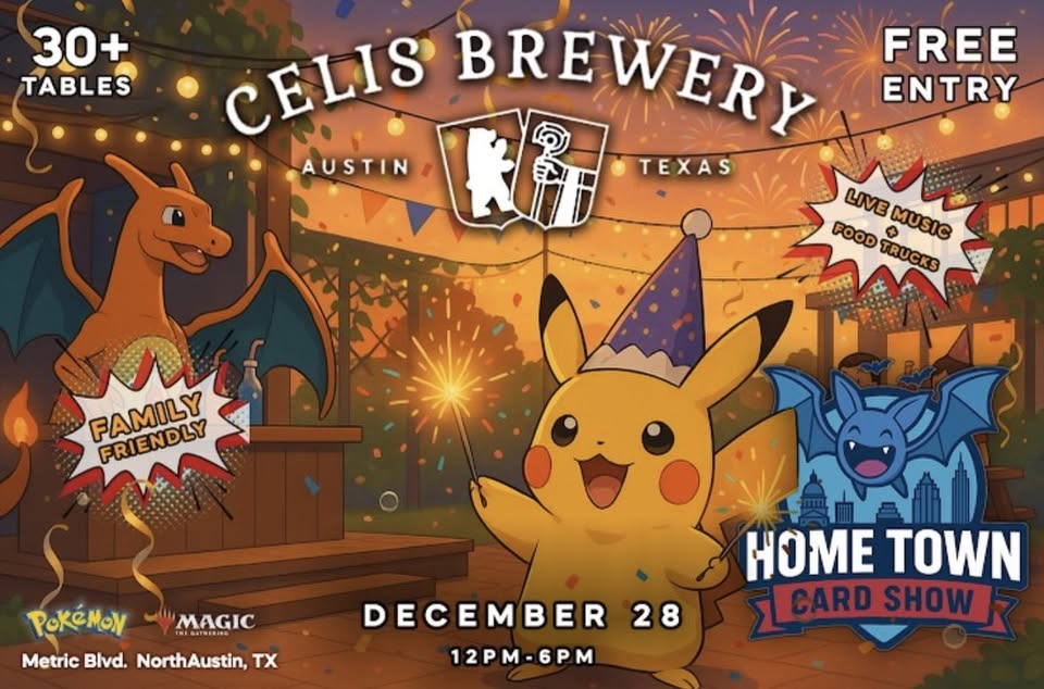 Hometown Card Show is taking over Celis Brewery for a Year-End Card Bash — a free, family-friendly card show built around collecting culture, local vendors, and an all-day hangout experience.