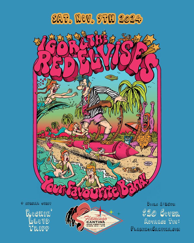 As an independent band, Red Elvises have produced 12 studio albums, two live albums, a live concert DVD, and a Greatest Hits compilation. Some of their most notable film contributions include music and or performances in “Six String Samurai”, “Mail Order Bride”, “Armageddon”, “Skippy”, “Melrose Place”, “Fastlane”, “Penn and Teller´s Sin City Extravaganza”, “VH-1 Behind the Music”, and “MTV”. Red Elvises have performed for large festivals, private parties, and played on massive stages such as 2005´s Live 8 Benefit Concert. No matter where they perform, Igor & Red Elvises always bring the party with them.