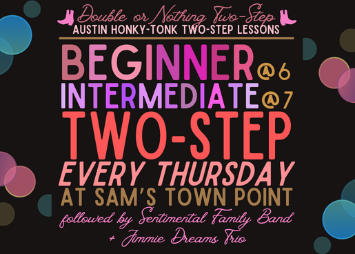 Join Double or Nothing Two-Step at 7:00 every Thursday night at Sam’s Town Point for INTERMEDIATE two-step lessons. Tips welcome!