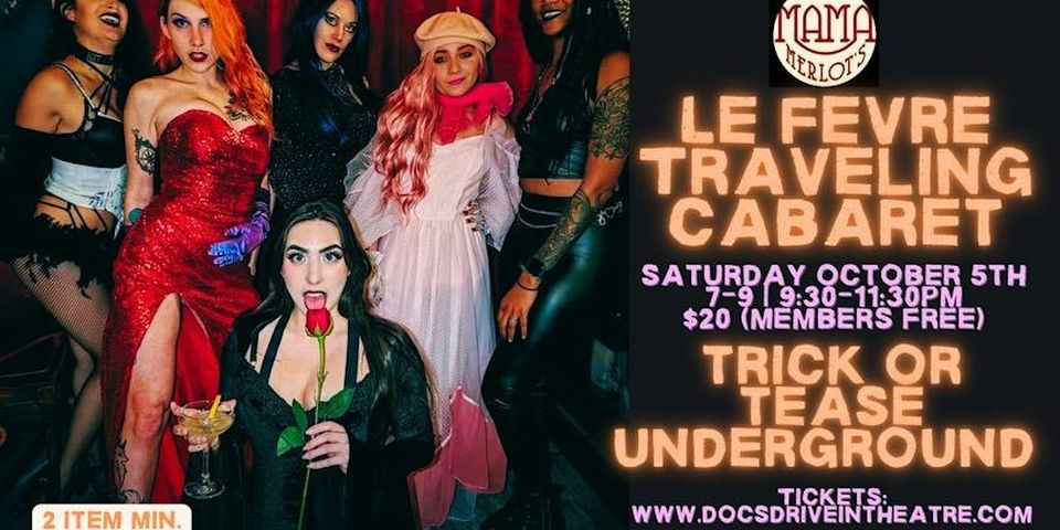 Welcome to **Le Fevre Traveling Cabaret**’s “Trick or Tease” event at the Speakeasy! Get ready for a night of thrilling performances and mysterious acts that will leave you on the edge of your seat. Join us on **Sat Oct 05 2024** at Mama Merlot’s Speakeasy for a night you won’t forget. Dress up in your spookiest costume and enjoy a night of entertainment like no other. Don’t miss out on this unique experience filled with magic, music, and mayhem. See you there!