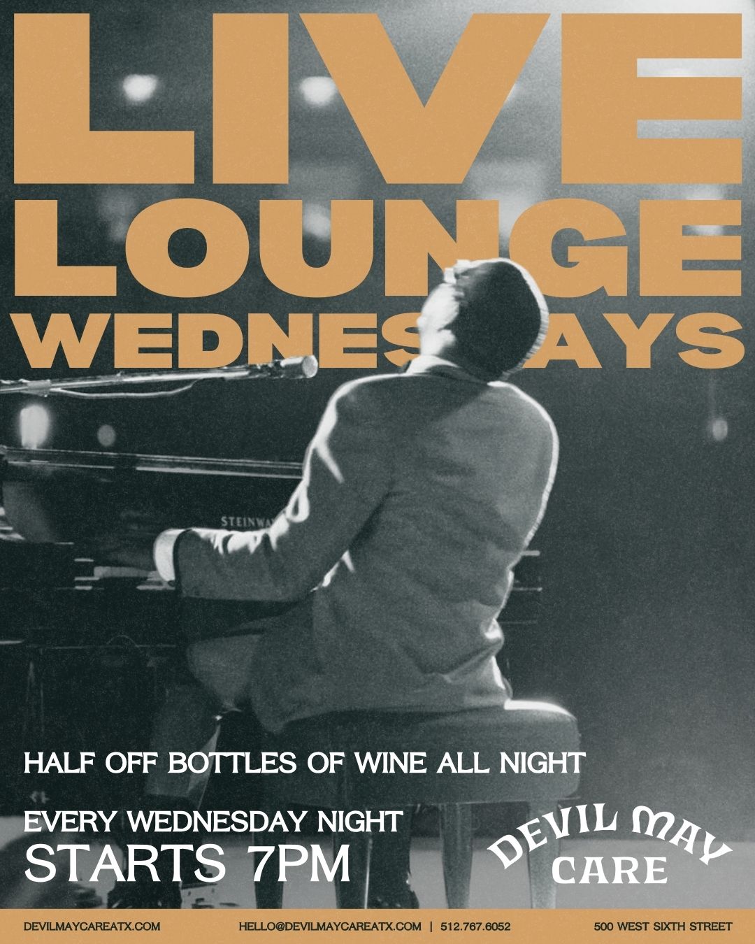 Live Lounge Wednesdays at Devil May Care in Austin offer an intimate midweek escape with live piano and acoustic sets starting at 7:00 PM.