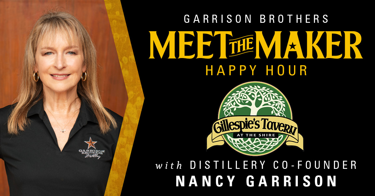 Join us for a Meet the Maker Happy Hour at Gillespie’s Tavern with Nancy Garrison. Enjoy sampling Garrison Brothers Small Batch and HoneyDew bourbons, and savor two special Garrison Brothers cocktails available for purchase. Don’t miss this opportunity to experience the exquisite flavor profiles of Garrison Brothers Bourbon with the Queen Bee herself! This event is free and open to the public.