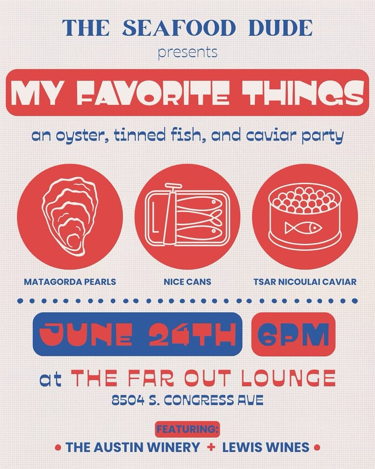 I´m poppin tins, Texas oysters, and bottles of wine from The Austin Winery and Lewis Wines. Featuring Oyster Bros, Just Nice Cans, and Tsar Nicoulai Caviar.