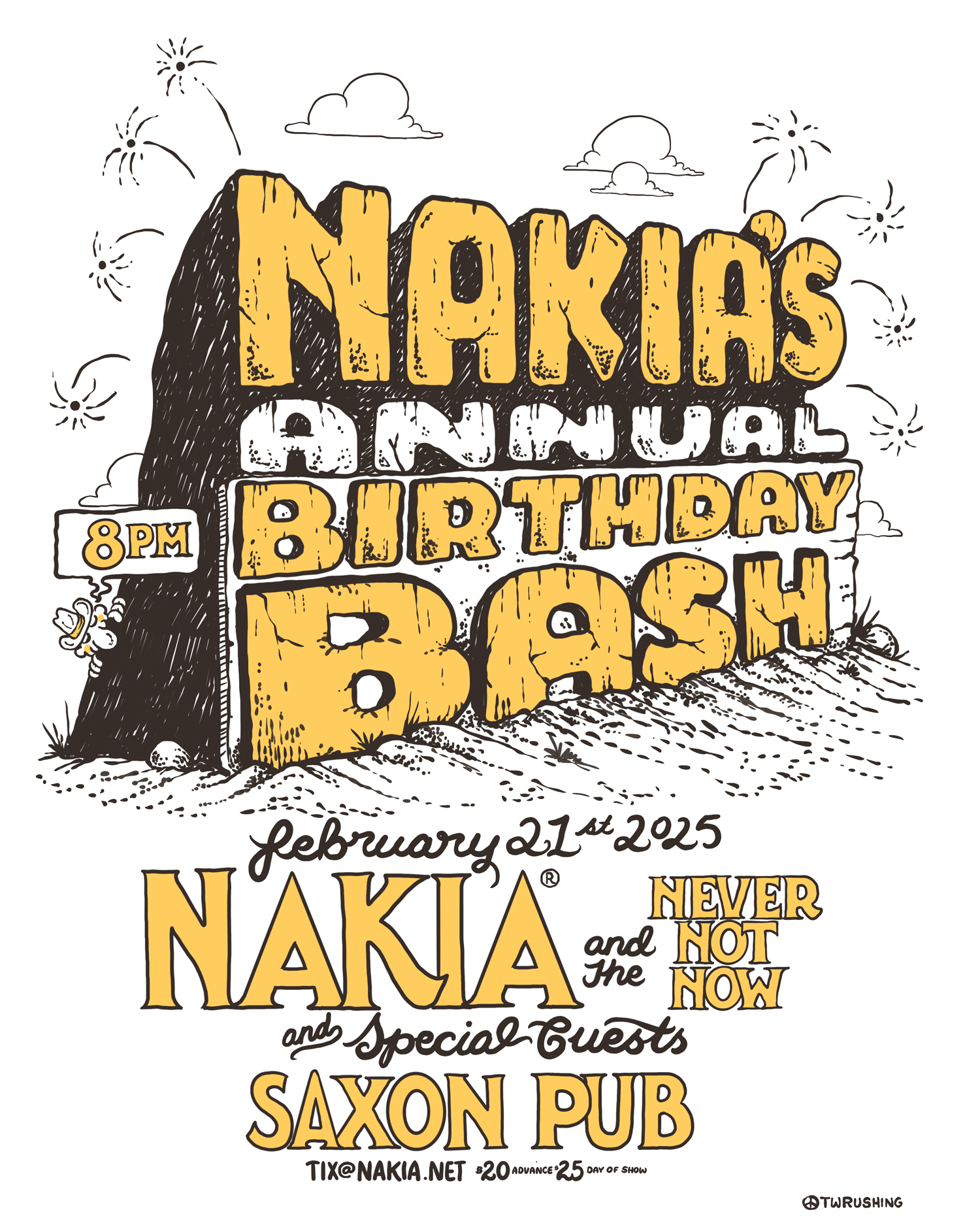 Don’t miss the triumphant return of Nakia’s Annual Birthday Bash after a 5-year hiatus on Friday, February 21st at 8 p.m. at The Saxon Pub.