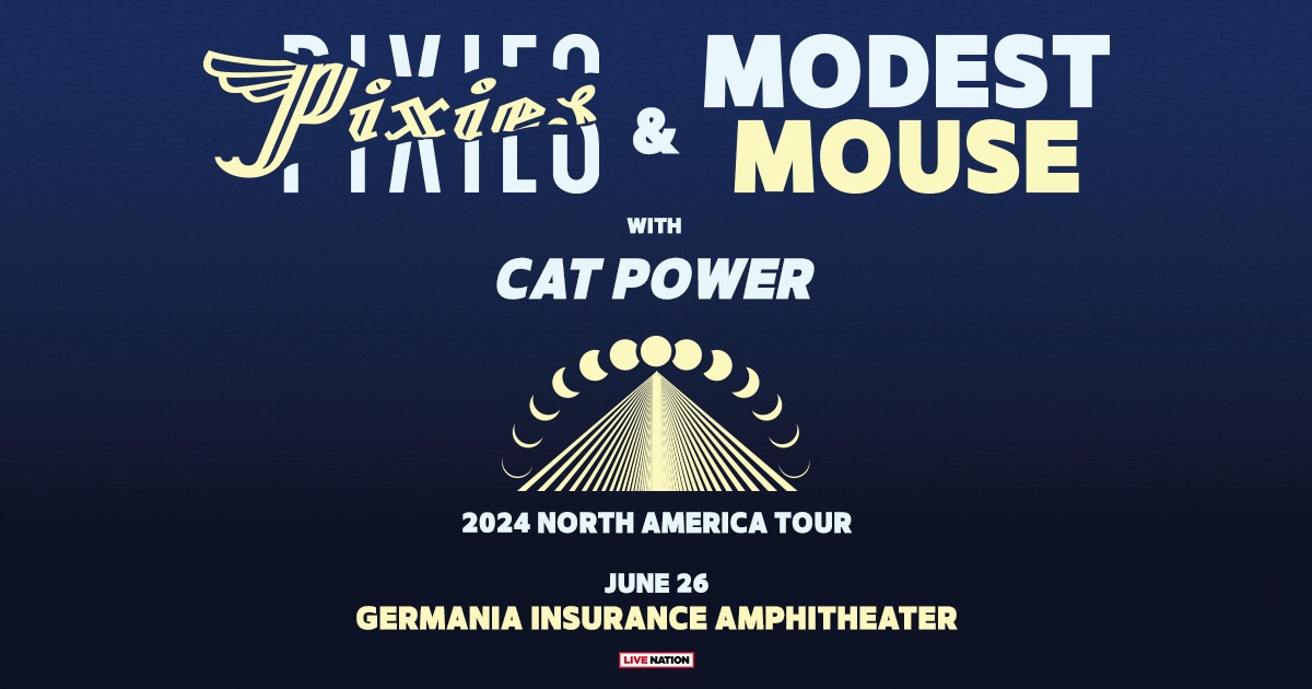 Pixies and Modest Mouse with Cat Power are coming to Germania Insurance Amphitheater on June 26th, 2024! Get your tickets now at – www.ticketmaster.com/event/3A0060338A0A449B