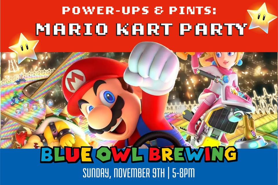 Rev up for Power-Ups & Pints: Mario Kart Party at Blue Owl Brewing! Sign up in advance, choose your racer, and get ready to battle it out on the track against fellow speedsters. Winners will take home big prizes–and serious bragging rights.