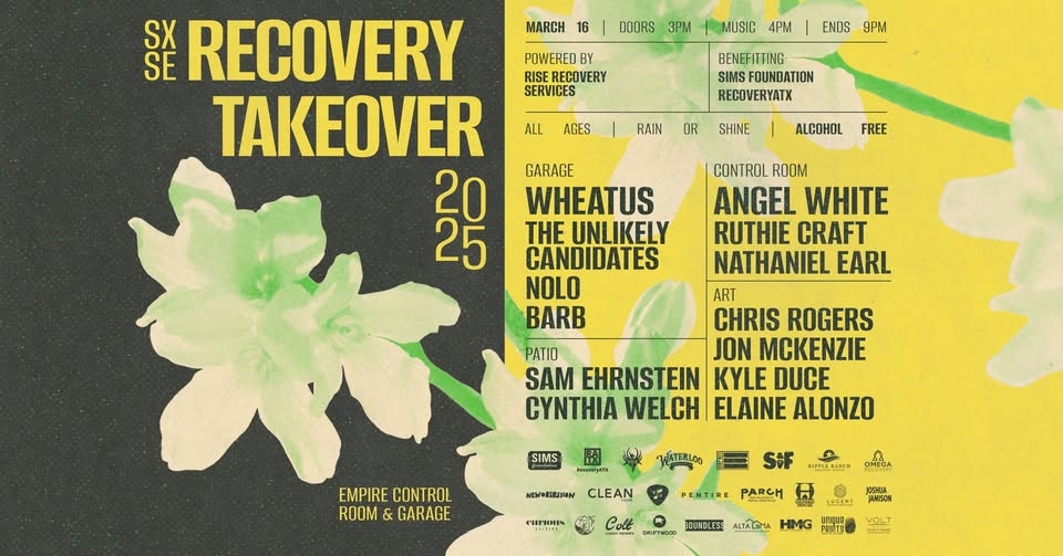Join us Sunday, March 16th at 4pm for the 3rd Annual “Sober X South East RECOVERY TAKEOVER” at Empire Control Room & Garage off 7th and Red River in downtown Austin, TX. All proceeds of this groundbreaking event powered by Rise Recovery Services benefit The SIMS Foundation and RecoveryATX.