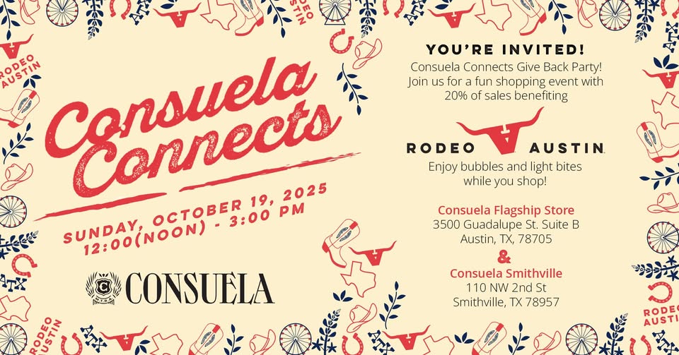 Join Rodeo Austin on October 19th at the Consuela Flagship store for a Consuela Connects Give Back Party! 20% of sales made in store or over the phone between 12 p.m. and 3 p.m. will be donated to Rodeo Austin’s mission of growing the next generation of Texas kids! Enjoy bubbles and light bites in store while you shop!