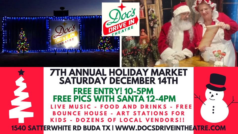 Join us on Saturday Dec 14, 2024 from 10:00 AM-5:00pm at Doc’s Drive In Theatre for a festive day of shopping, food, and fun! Santa and Mrs. Claus will be making a special appearance from 12pm-4pm, so bring the whole family for a day of holiday cheer and take your FREE PHOTO with them!