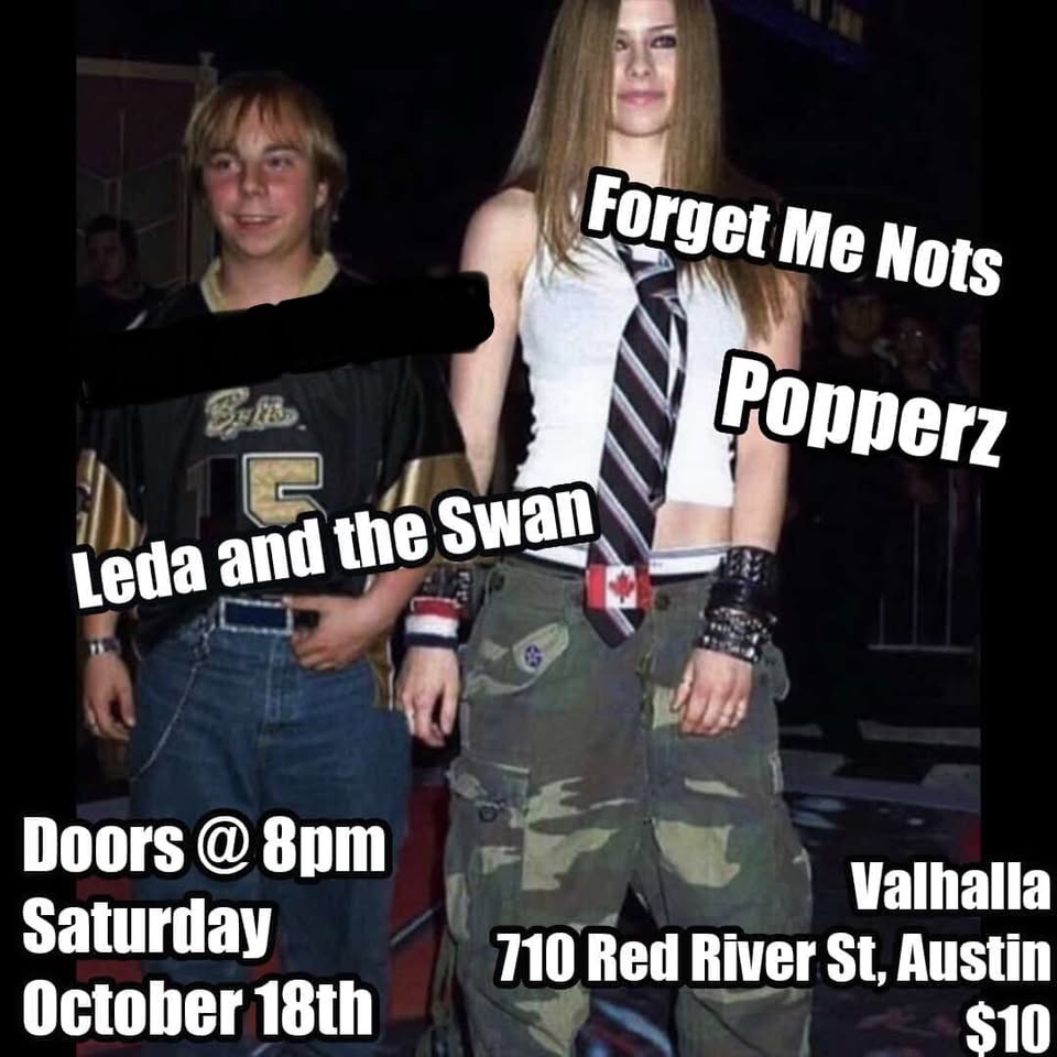 Back to Saturday Oct 18 Forget-Me-Nots, Popperz, Leda and the Swan