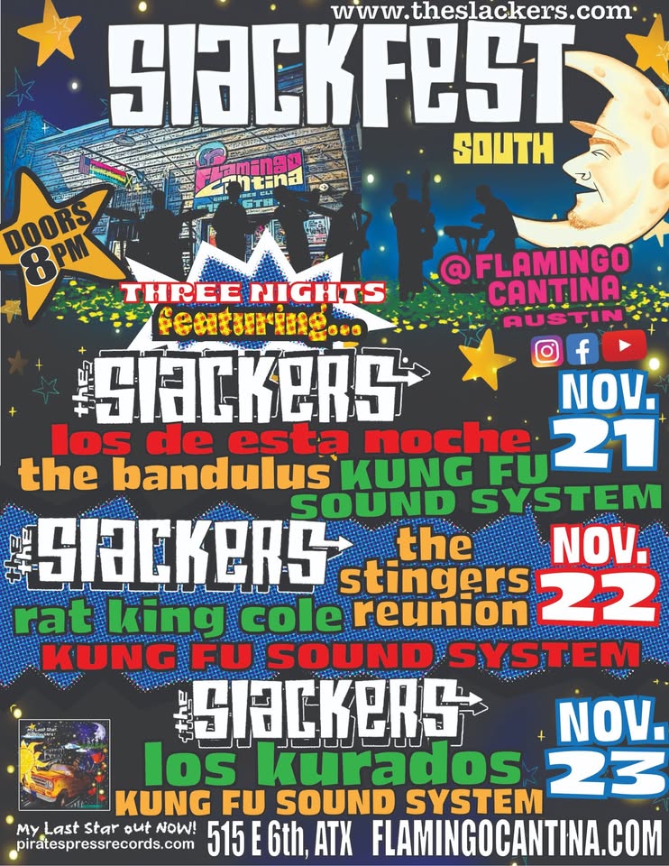 Slackfest South is bringing a three-day lineup of reggae/ska/soul/latin/punk shows to Flamingo Cantina this November, headlined by The Slackers; with The Bandulus, Los de Esta Noche, Kung Fu Sound System, The Stingers, Rat King Cole, and Los Kurados.