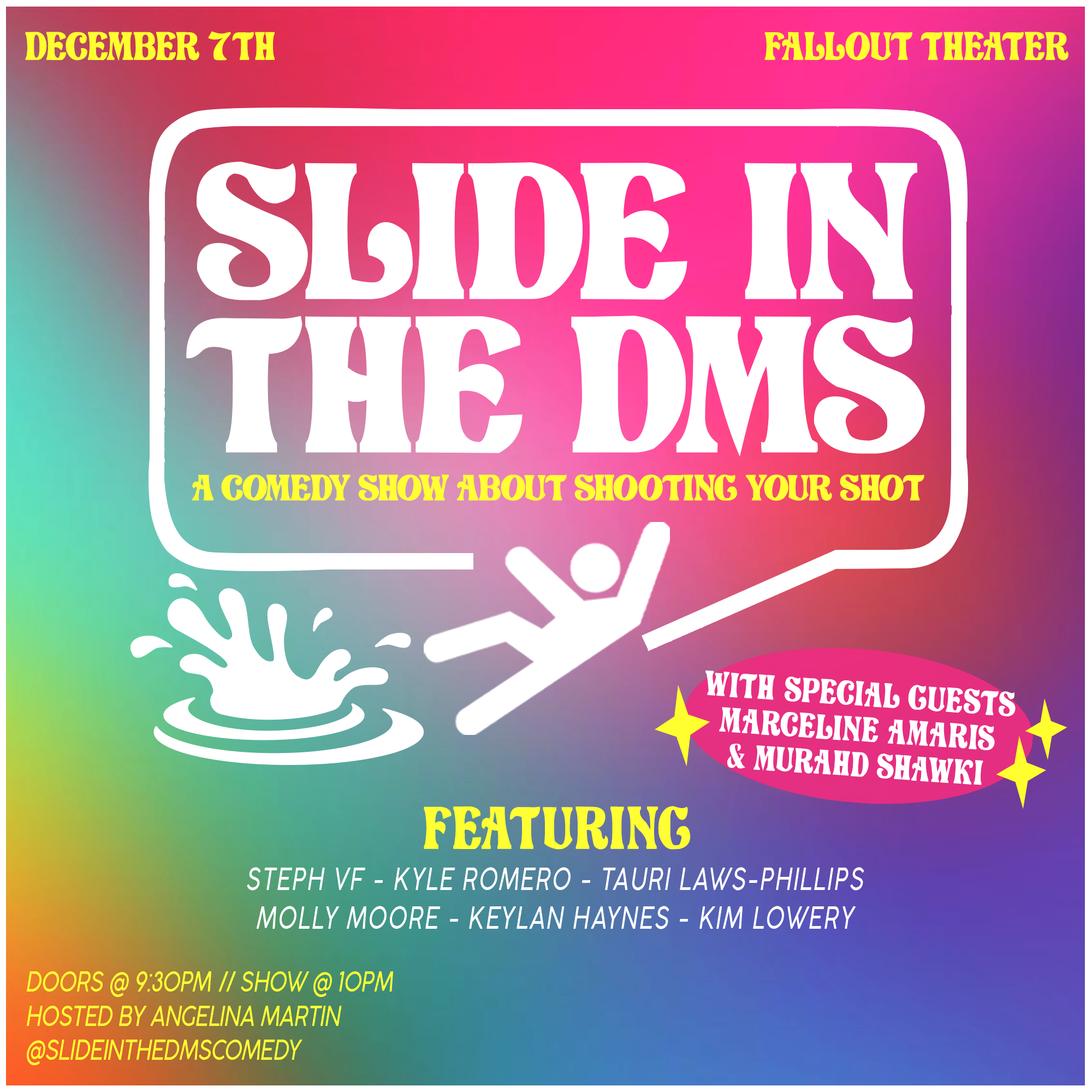 On Saturday, December 7th at 10pm, come to Fallout Theater for Slide in the DMs, a uniquely entertaining monthly comedy show inspired by the ridiculous inboxes of comedians & local celebrities!