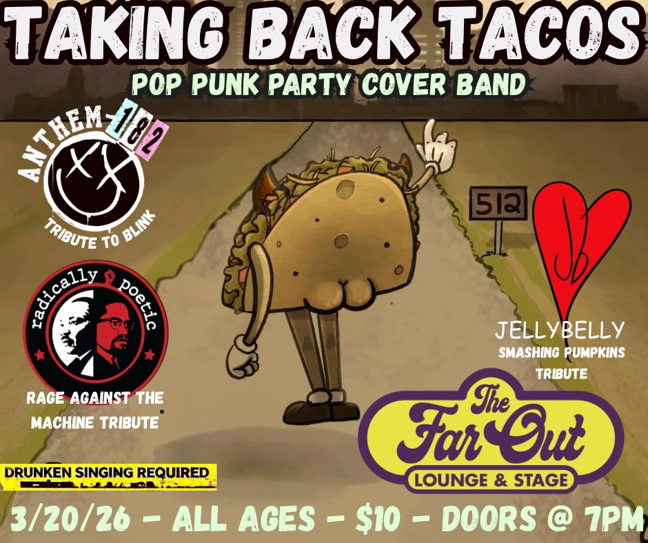Relive the glory days of AIM away messages, skinny jeans, and power chords with Taking Back Tacos — your favorite Pop Punk Party Cover Band bringing all the hits you forgot you still know every word to.