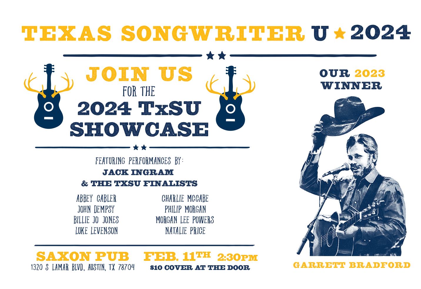 About Us: Texas Songwriter U (TxSU) is an annual songwriting discovery and development program comprised of a songwriting competition, educational workshop, and showcase event. Founded in 2014, the mission of TxSU serves to identify, develop and support the best adult songwriters in Texas, while improving upon the quality and quantity of professional songwriting across our state. Texas Songwriter U is a 501(c)(3) non-profit fully supported with the help of American country music artist Jack Ingram, Broadcast Music, Inc. (BMI), and The Texas Heritage Songwriters’ Association.