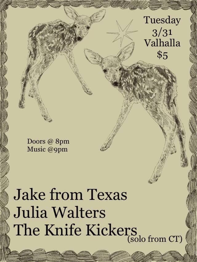 Tuesday March 31 Knife Kickers, Julia Walters, Jake from Texas