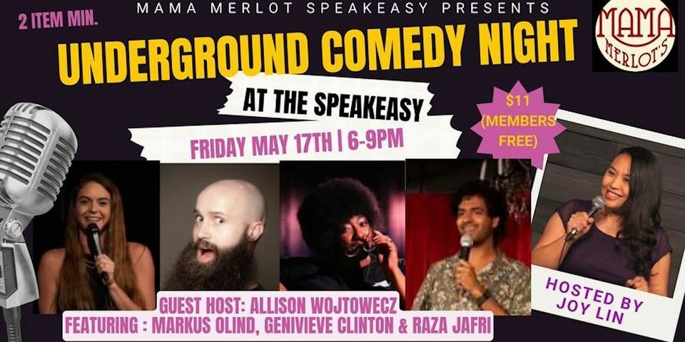 Welcome to Underground Comedy Night at the Speakeasy ! Get ready for a night of laughs and good times at Mama Merlot’s Speakeasy. Join us on Friday May 17 2024 at 6:00-9:00PM for a hilarious lineup of local comedians ready to make you laugh until your sides hurt.